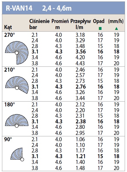 Ręcznie regulowane dysze rotacyjne o zmiennym kącie i zasięgu. 2,4-4,6 M