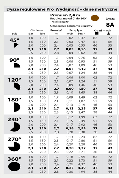 Większość dysz zaprojektowano, tak aby dawały optymalne strumienie wody w typowych przedziałach 90°, 180° i 360°. Dzisiaj jednak, coraz więcej terenów wymaga stosowania dysz, które można ustawić na zraszanie w innym, niż typowym zakresie kąta. Trawniki, grządki i inne tereny tworzone są z figur nieregularnych geometrycznych i wymagają efektywnego nawadniania. Dysze Hunter można ustawiać w zakresie 0°-360° i wyregulować na odpowiednie odległości. Nigdy nie będziesz miał problemu, że nawadniasz zbyt duży teren, że marnujesz wodę lub też, że zbyt słabo nawadniasz. Nie musisz używać żadnych narzędzi, aby wyregulować zraszacz.