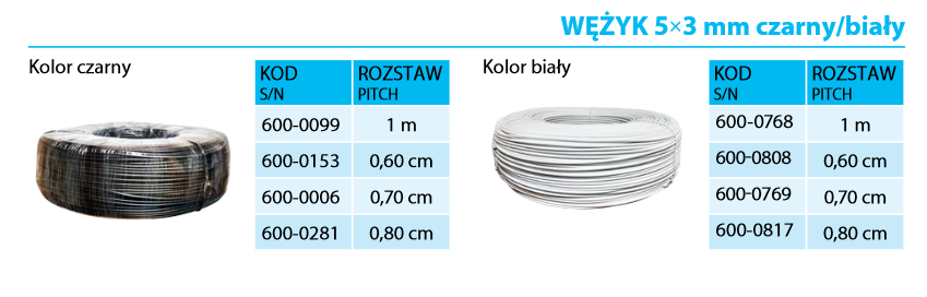 Wężyki mają długość 0,70 m, co pozwala na stosowanie nawodnień przy różnych szerokościach międzyrzędzi oraz różnych metodach uprawy.